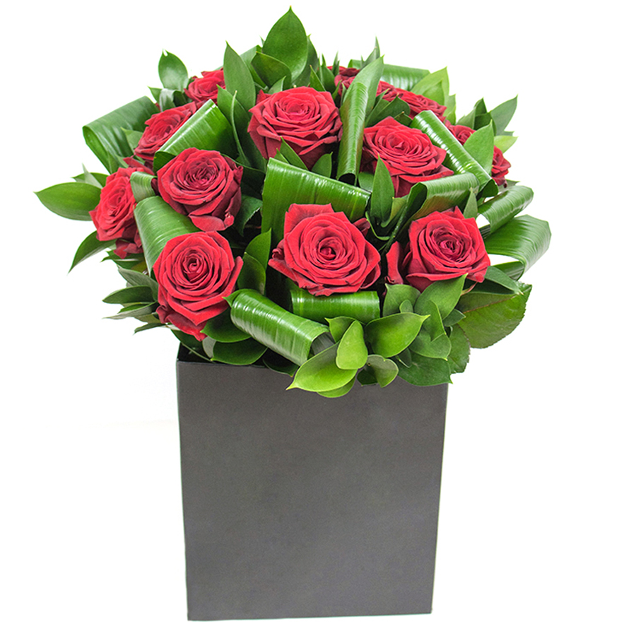 Delight in the graceful beauty of our bouquet, featuring vibrant red roses, fresh aspidistra leaves, and delicate ruscus. This unique design enhances any space with elegance and style.