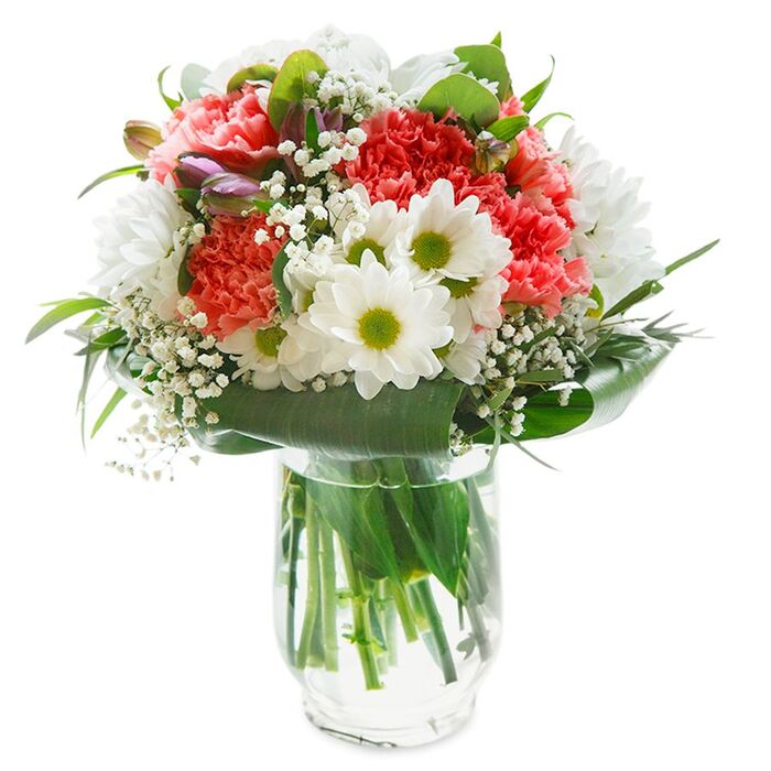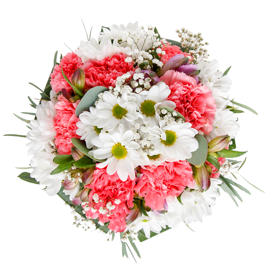 Invoke a sense of calm and beauty with our pure and serene flower arrangement. Featuring a stunning mix of snow-white chrysanthemums, ethereal gypsophila, and light pink carnations, artfully arranged with luxurious aspidistra leaves.